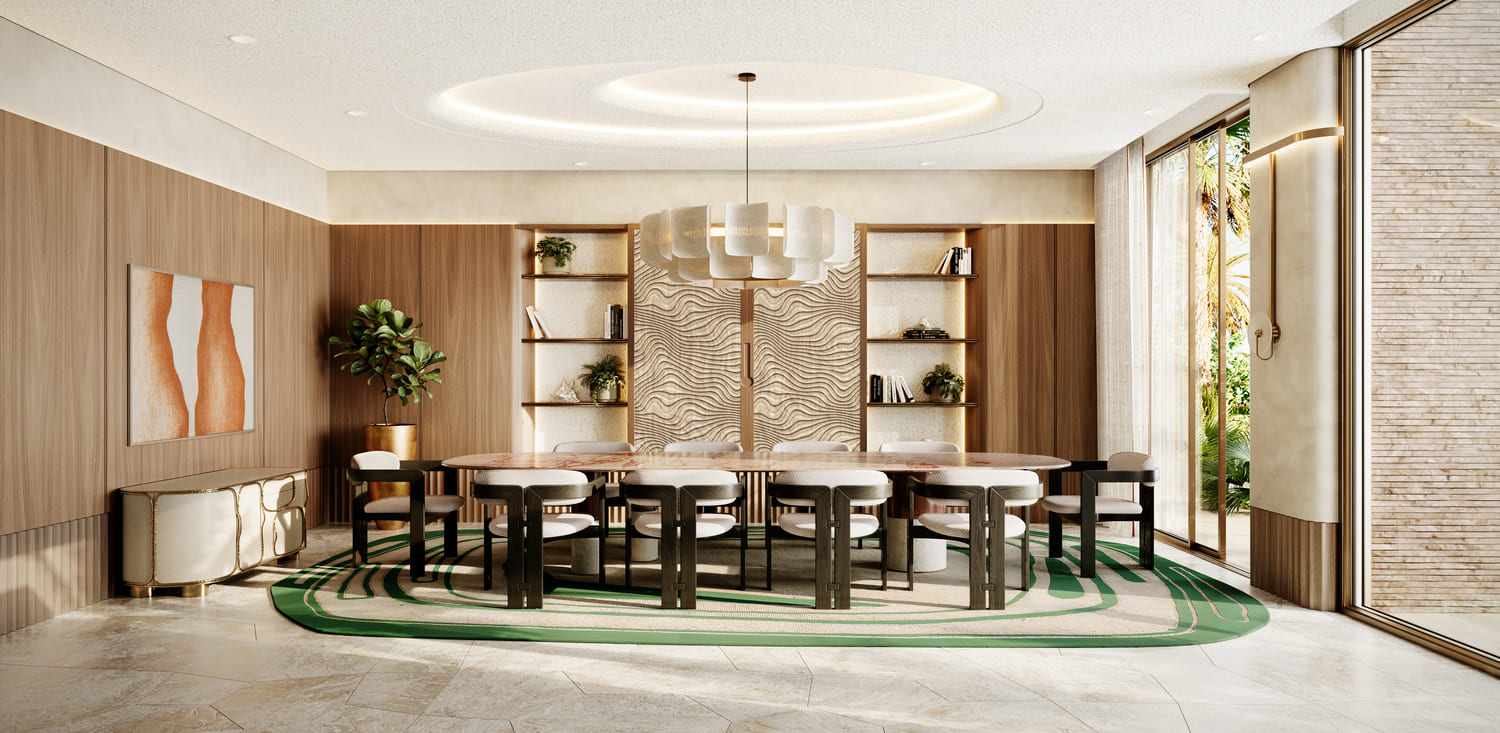 Neuf immeubles longent 500 m de plage privée, dévoilant des panoramas ouverts sur le Golfe et la skyline. Pierre naturelle, boiseries, hauteurs sous plafond jusqu’à 6 m, plans fluides et terrasses généreuses—avec piscines privées sur certaines typologies—offrent la sensation d’une villa suspendue entre ciel et mer.
